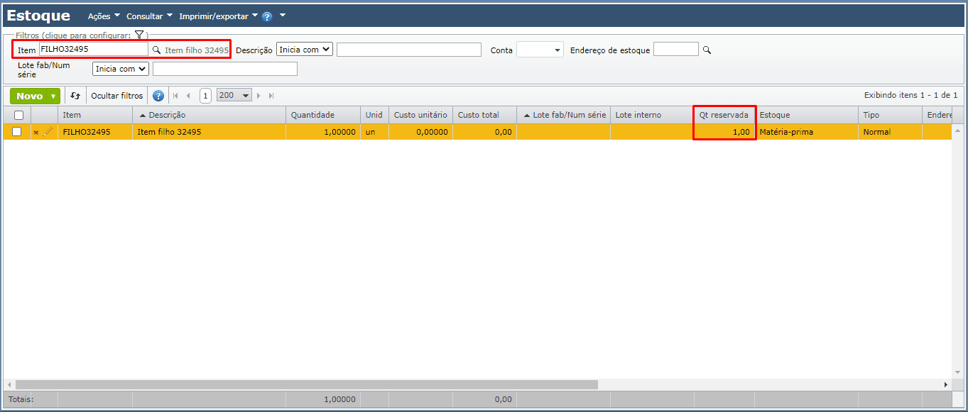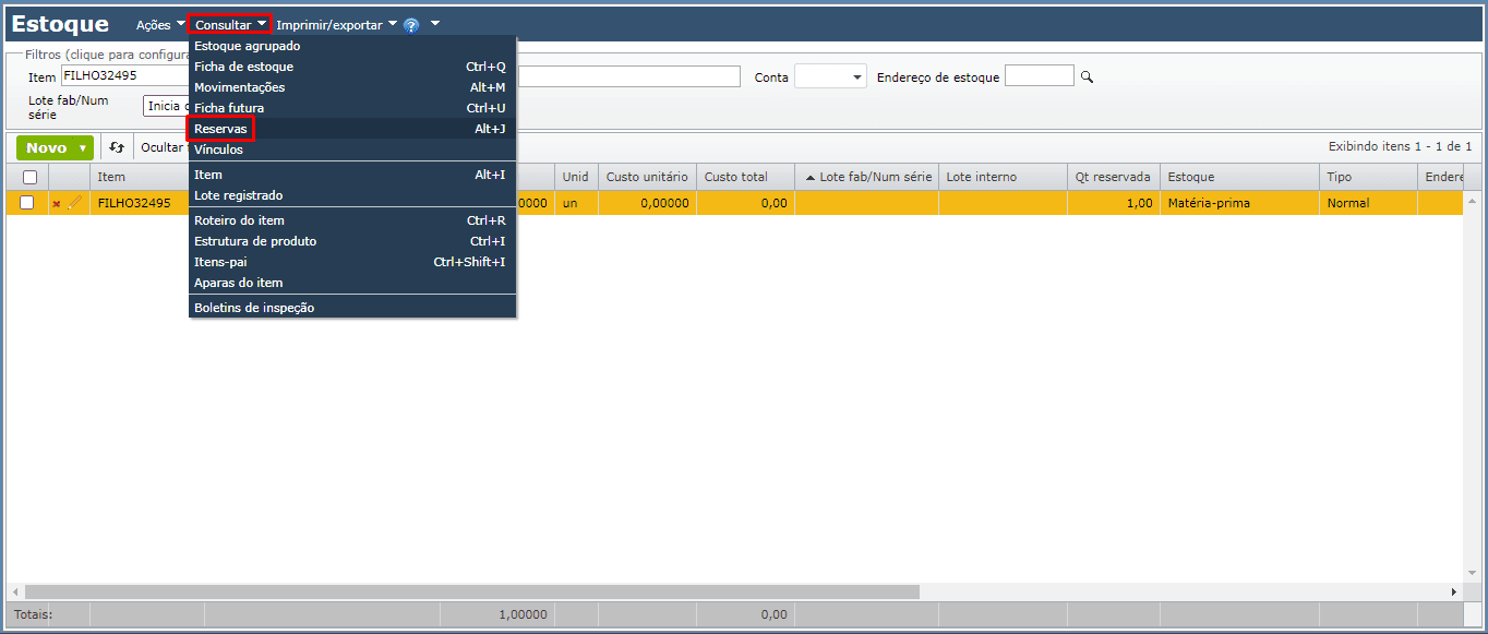 Observação: Também é possível verificar acessando a tela de reservas diretamente através do menu “Estoque” > “Reservas” e filtrando pelo código do item.