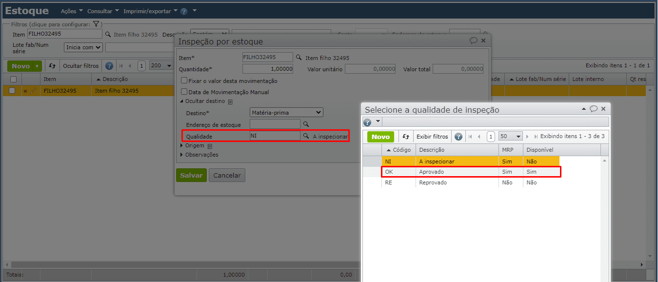 - Para inspecioná-lo, basta selecionar o registro, acessar “Ações” > “Inspecionar selecionado(s)” e informar uma “Qualidade” que o disponibilizará para baixa na ordem de produção:
