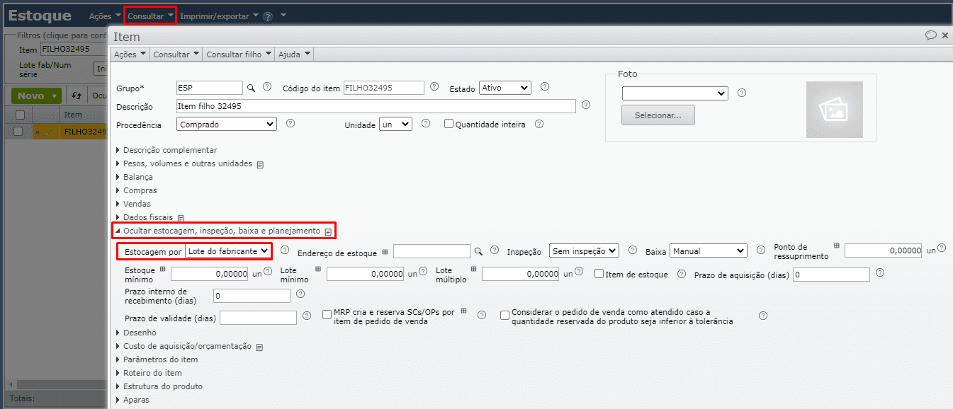 - Caso o item está configurado com este tipo de estocagem erroneamente, basta selecioná-lo, acessar o menu “Consultar” > “Item” > “Estocagem, inspeção, baixa e planejamento” e alterar o preenchimento do campo “Estocagem por”: