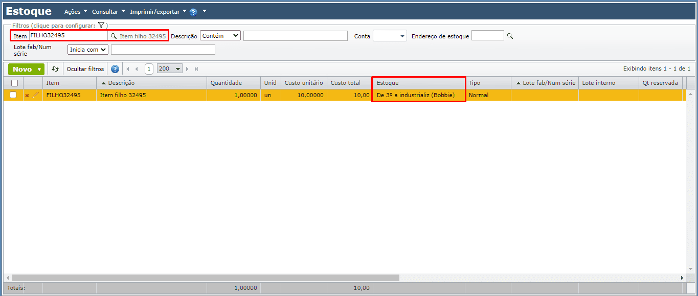 - Depois, acesse o menu “Estoque” > “Estoque” e filtre a tela pelo código do insumo: