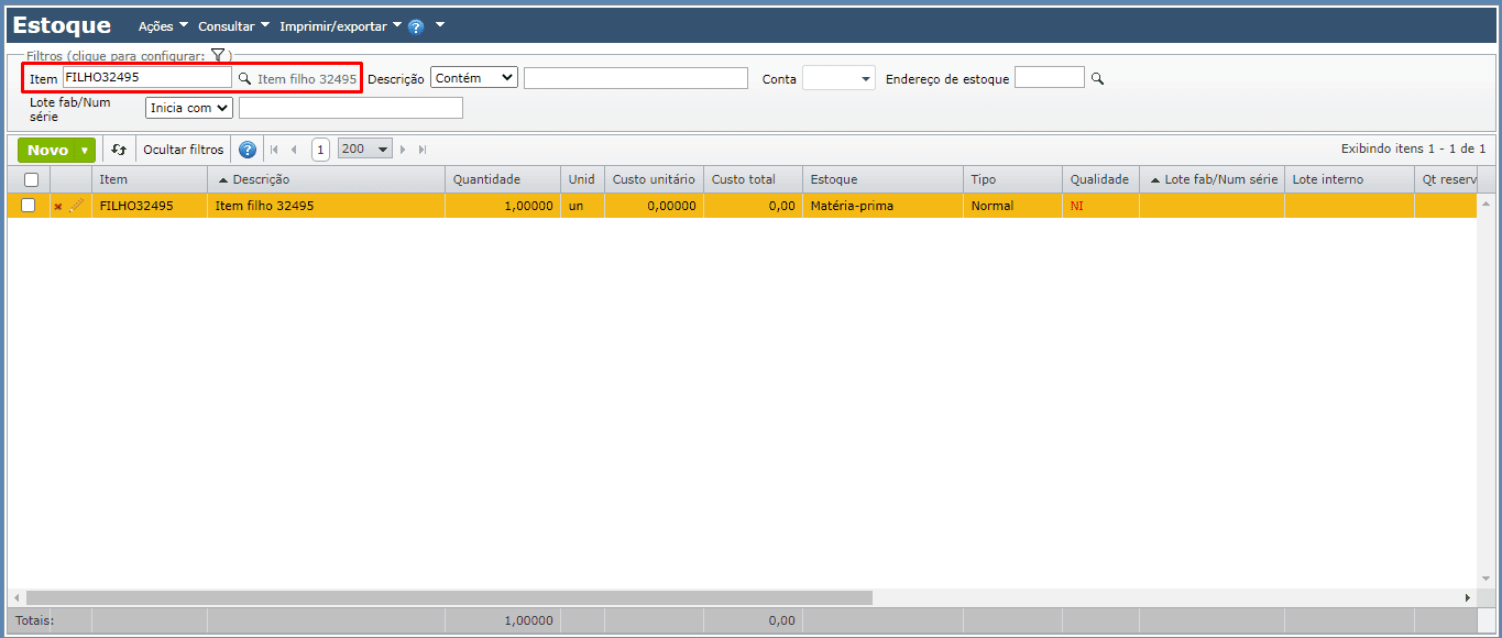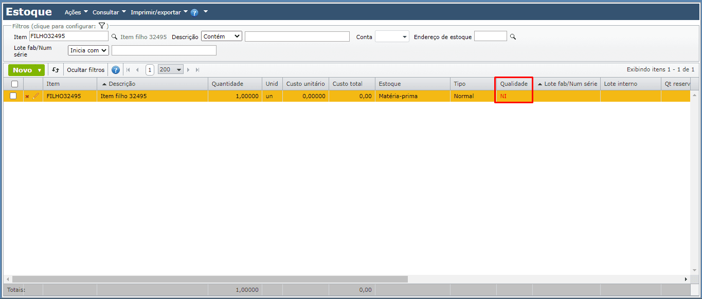 - Verifique o preenchimento da coluna “Qualidade”, pois, estando como “NI”, significa que este estoque não poderá ser utilizado até ser inspecionado: