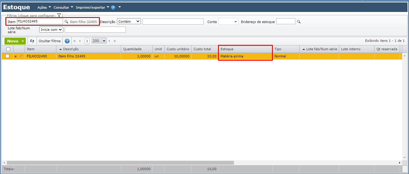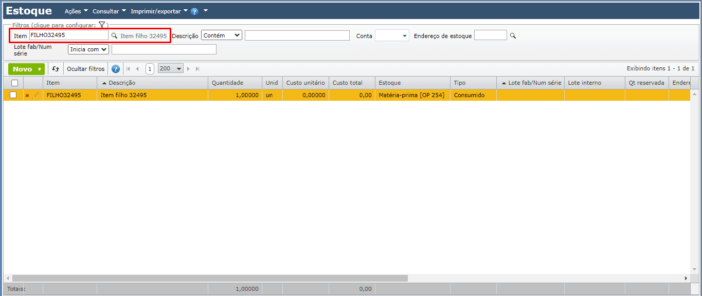 - Acesse o menu “Estoque” > “Estoque” e filtre a tela pelo código do insumo:
