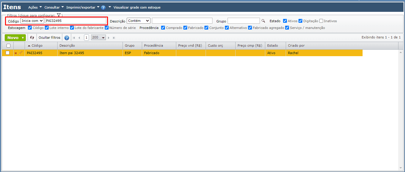 - Porém, caso o item realmente for de terceiros e, portanto, a ligação pai-filho está incorretamente cadastrada, basta acessar a tela “Itens” > “Itens”, consultar pelo item pai (item sendo fabricado na ordem de produção verificada no ponto 1):
