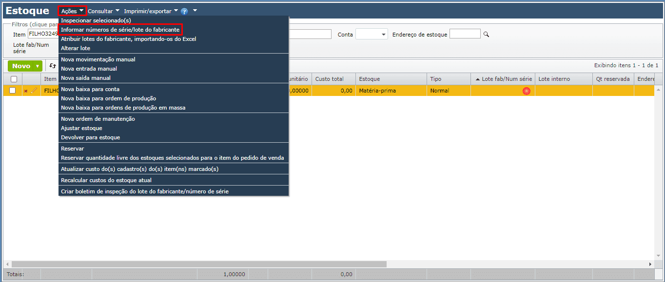- Para informar um lote/número de série, acesse “Ações” > “Informar número de série/lote do fabricante”: