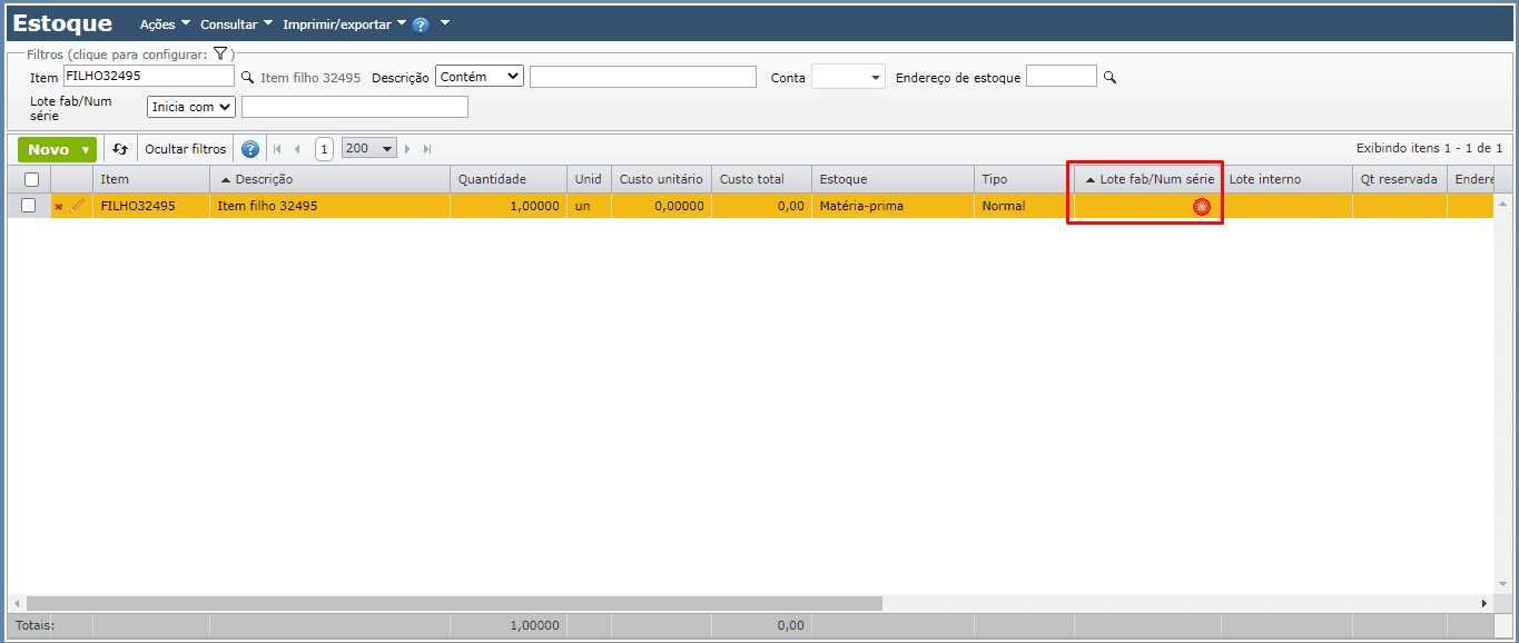 - Verifique a coluna “Lote do fabricante/número de série” e, caso estiver com um ícone de uma bola vermelha, significa que não foi informado o lote ou número de série: