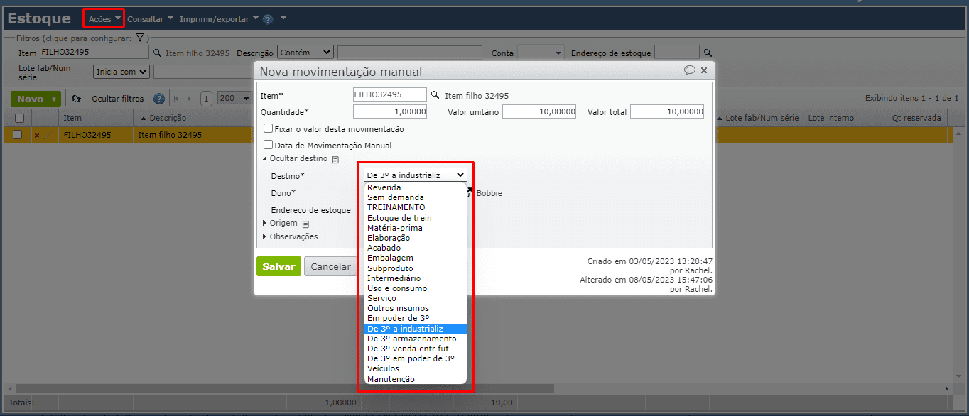 - No exemplo, percebemos que este estoque é do terceiro “Bobbie”. Caso não deverá ser um estoque de terceiro, será necessário desfazer o recebimento da NFR de entrada do produto ou realizar uma movimentação manual desse estoque para um estoque próprio, através do menu “Ações” > “Nova movimentação manual”:
