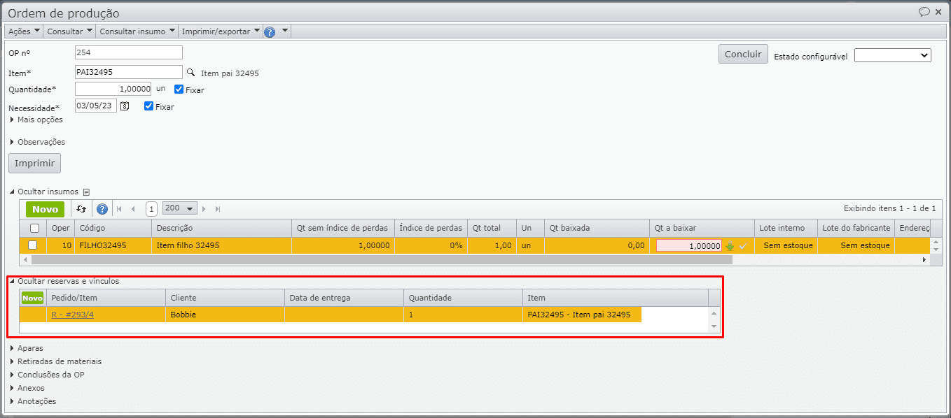 - Verifique a reserva exibida na seção “Reservas e vínculos” da ordem de produção, através do menu “Produção” > “Ordens de produção”: